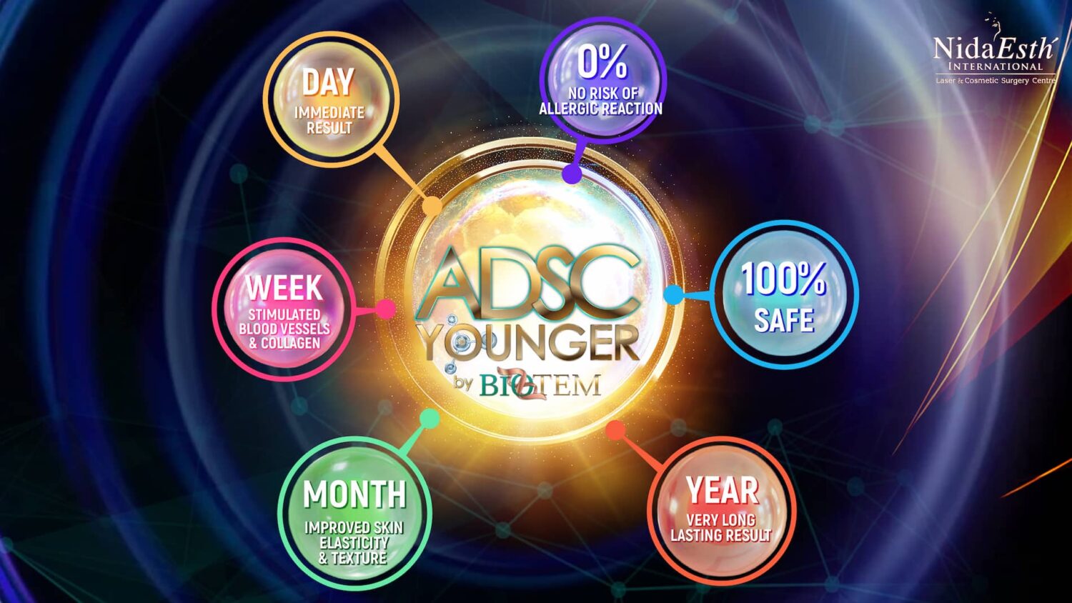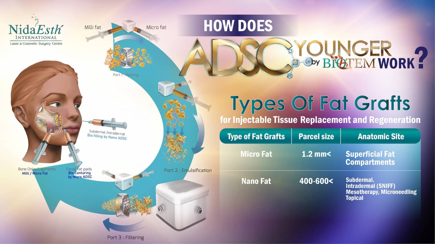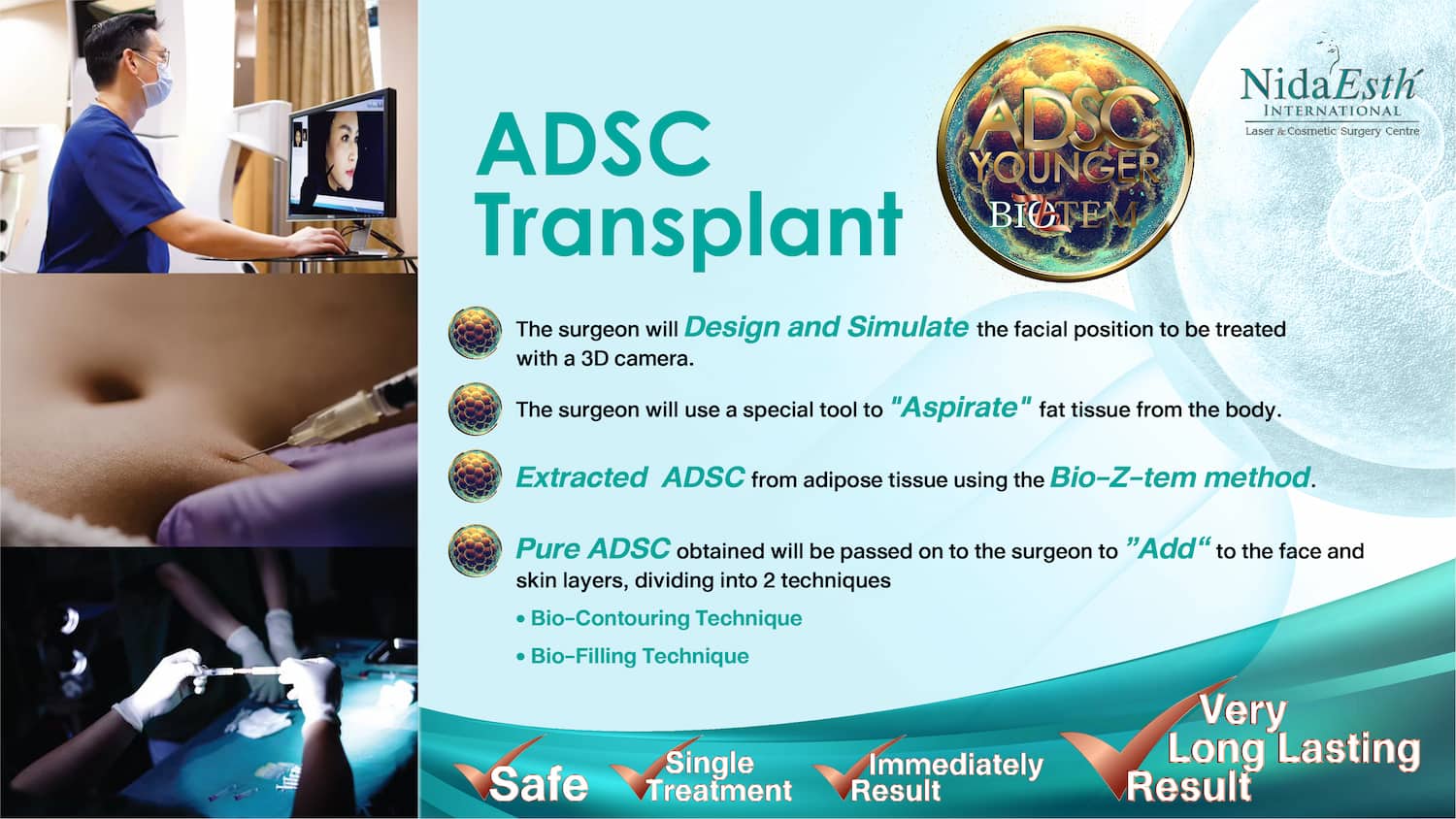 “ADSC ย่อมาจาก Adipose-Derived Stem Cells เป็นการสกัดสเต็มเซลล์ด้วยเทคโนโลยี Bio-Z-tem ซึ่งเป็นวิธีการสกัดเซลล์ล่าสุดที่มคิดค้นขึ้นเพื่อให้ได้ Stem Cell Younger ในรูปแบบของ Micro ADSC และ Nano ADSC แล้วนำมาใช้ในการปรับเปลี่ยนโครงหน้า ฟื้นฟู คืนความอ่อนเยาว์ได้อย่างน่าอัศจรรย์”