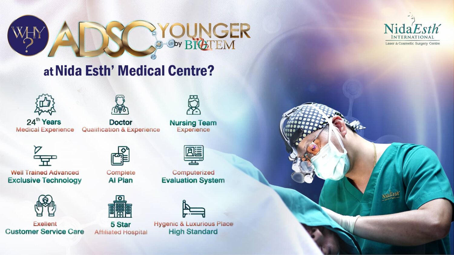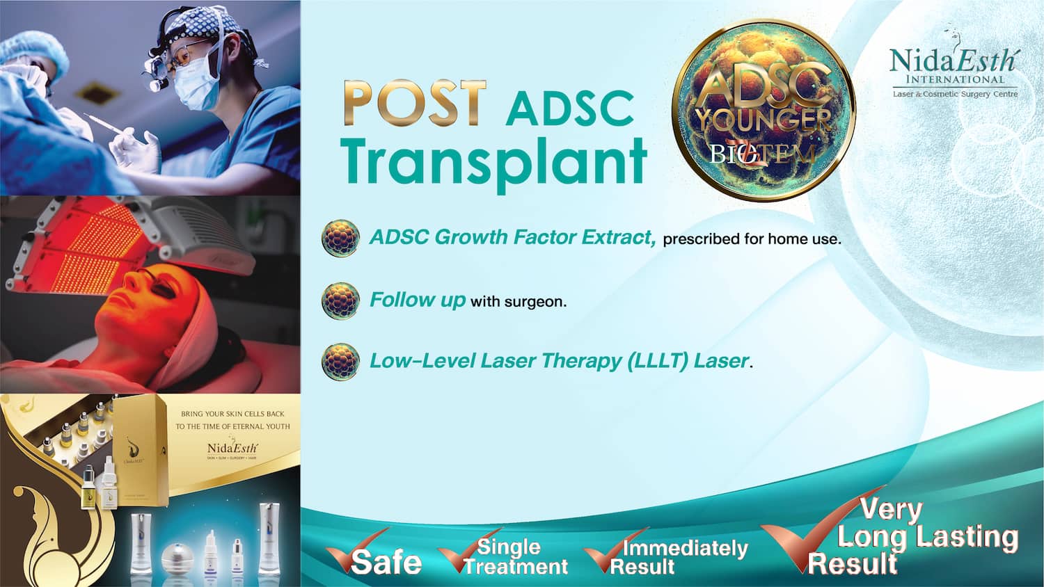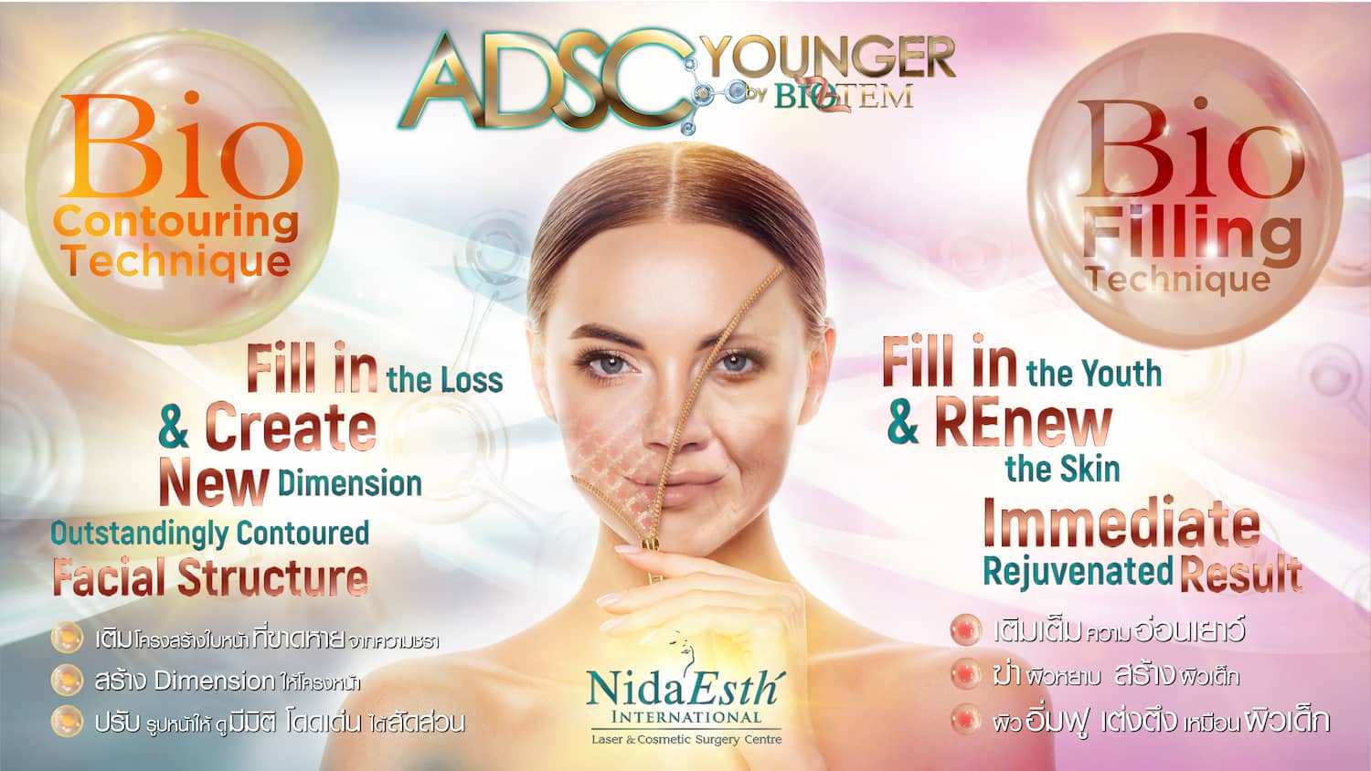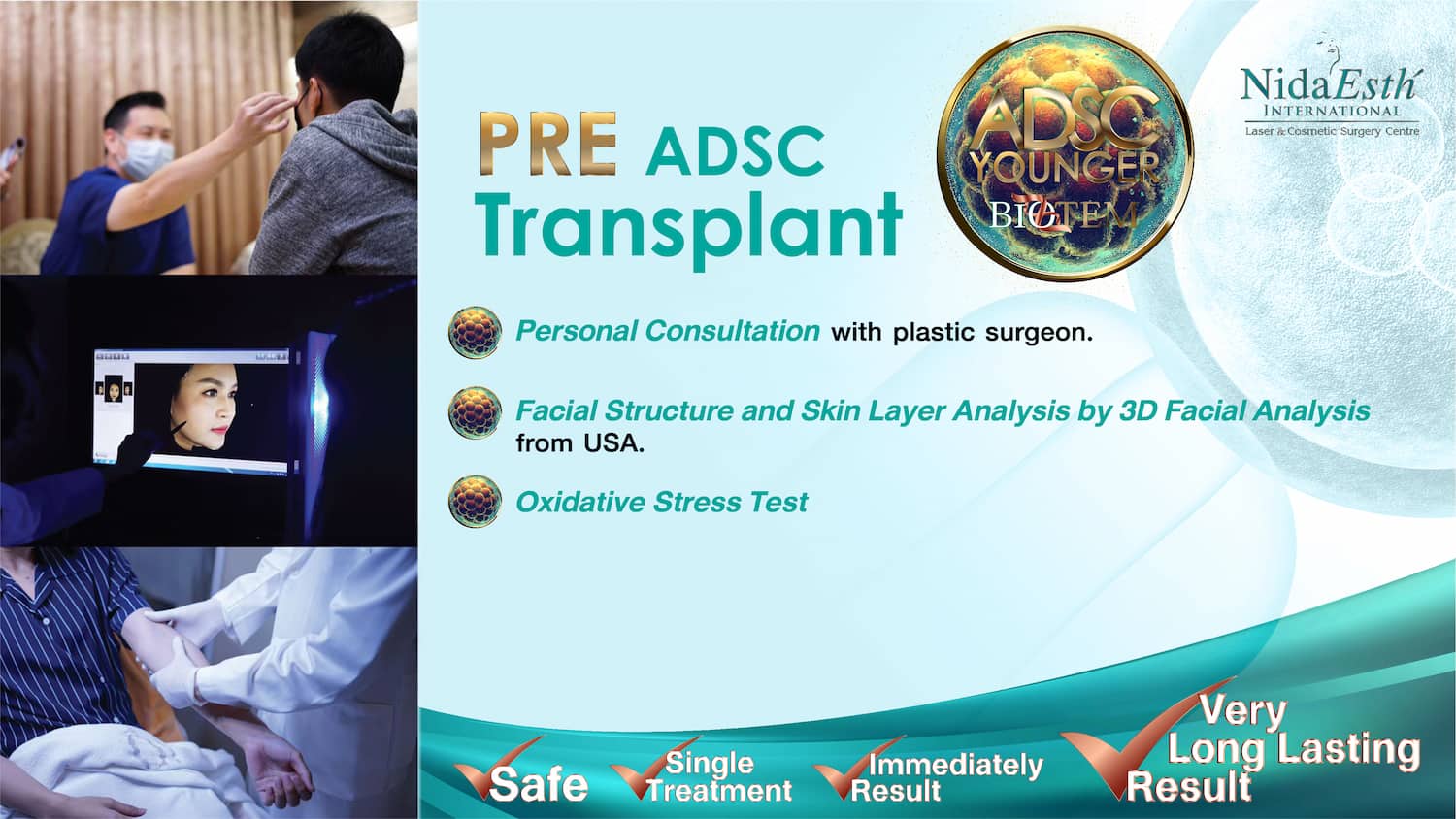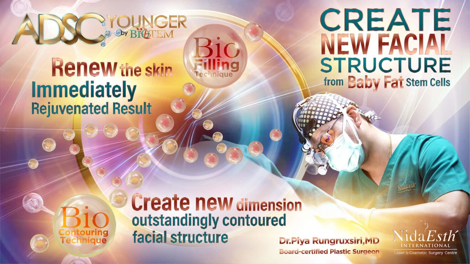 ADSC Younger เป็นเทคโนโลยีทางการแพทย์ที่ล้ำสมัยที่ผสมผสานศาสตร์แห่งการศัลยกรรมและวิทยาศาสตร์ชีวภาพด้วยเทคนิคเฉพาะเพื่อปรับเปลี่ยนใบหน้าและผิวพรรณให้ดูอ่อนเยาว์กว่าอายุจริงของผู้เข้ารับการรักษาอย่างเป็นธรรมชาติ โดยใช้ Stem Cell สำหรับ Facial Rejuvenation หรือ ADSC Stem Cell ของผู้เข้ารับการรักษาเอง ซึ่งนับว่าเป็นจุดเปลี่ยนที่สำคัญจากการฉีดไขมันแบบเดิมๆ ครับ”