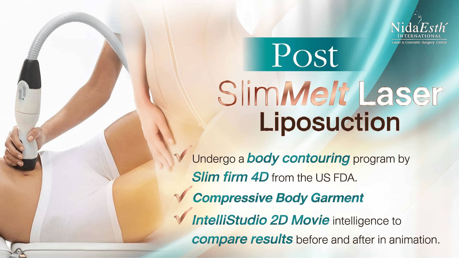 • การดูดไขมันด้วย Slim Melt by Slim Lipo ที่ Nida Esth’ ไม่ใช่แค่การดูดไขมัน แต่ยังมีโปรแกรมจัดกรอบกระชับรูปร่างดูแลคนไข้อย่างต่อเนื่องเพื่อรูปร่างที่เพรียวสวยกระชับยิ่งขึ้นด้วยโปรแกรม Slim Firm 4D โดยไม่ต้องเสียค่าใช้จ่ายเพิ่มเติม เหมาะสำหรับการดูดไขมันเฉพาะส่วน เช่น ต้นขา เหนียง แก้ม หน้าท้อง ปีกหลัง และยังสามารถสร้าง sixpack ระดับพรีเมี่ยม เพื่อให้รูปร่างที่เพรียวกระชับตามต้องการ