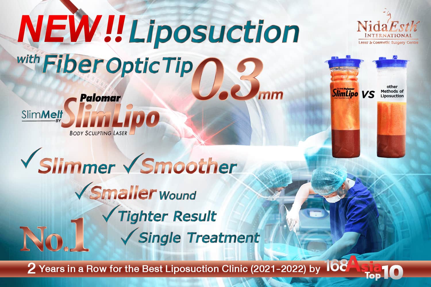 • เป็นเทคโนโลยีใน South East Asia ที่ Nida Esth’ Medical Center เลือกเฟ้นเข้ามาเพื่อหลอมละลายไขมันให้กลายเป็นน้ำมันและดูดออกมาในเวลาเดียวกันด้วยเลเซอร์หัวเข็มขนาดจิ๋วเพียง 3 มม. ปลอดภัยได้มาตรฐานจาก US FDA เหมาะสำหรับผู้ที่ต้องการกำจัดไขมันเฉพาะส่วน เช่น ต้นขา เหนียง แก้ม หน้าท้อง ปีกหลัง สร้าง sixpack ระดับพรีเมี่ยม