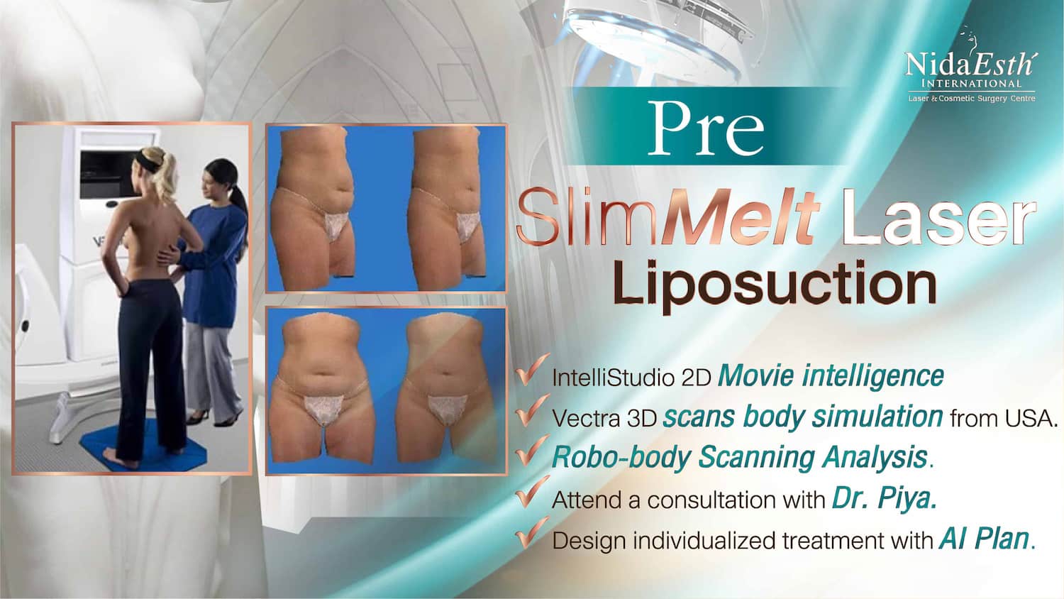 “ดังนั้นสำหรับคนที่สนใจและกำลังมองหาทางเลือกที่ดีที่สุดสำหรับการมีรูปร่างในอุดมคติดั่งฝัน สามารถเข้ามาปรึกษาเพิ่มเติมแบบเจาะลึกส่วนตัวกับ ‘คุณหมอปิยะ’ โดยเริ่มจากขั้นตอนแรกที่สำคัญคือ Body Simulation Design by Vectra 3D ในการออกแบบรูปร่างแบบ 3 มิติ ด้วย Vectra เพื่อการวิเคราะห์และแนะนำแนวทางการรักษาอย่างปลอดภัยเชื่อถือได้และแม่นยำ ด้วยระบบ Vectra’s High Definition สามารถสร้างภาพ 3 มิติ ทำให้คุณสามารถเห็นรูปร่างเสมือนจริงหลังได้รับการรักษา ไม่ว่าจะเป็นการดูดไขมันเฉพาะส่วน เช่น ต้นขา เหนียง แก้ม หน้าท้อง ปีกหลัง หรือแม้กระทั่งการสร้าง sixpack ระดับพรีเมี่ยม โดย Body Simulation Design by Vectra 3D สามารถช่วยให้คุณเห็นภาพล่วงหน้าของผลลัพธ์ที่เป็นไปได้อย่างแม่นยำ”